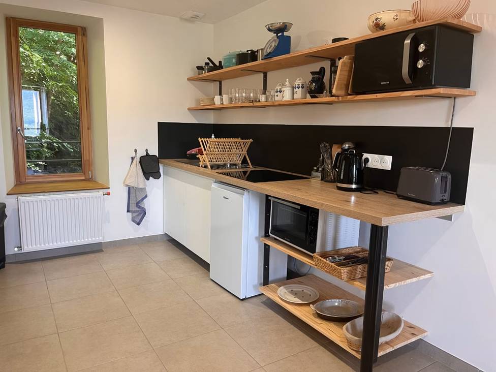 Du haut du troisième étage, on aperçoit le profil des Trois Becs et bientôt la lumière du matin vient réchauffer les vitres du salon. Si l’envie est de boire un petit café, il n’y a seulement quelques marches à descendre pour s’installer en terrasse. Bien sûr vous pouvez également vous attabler au restaurant les jours d’ouverture (du mercredi midi au dimanche soir), descendre acheter des financiers ou des picodons à l’épicerie, profiter des événements du vendredi soir ou encore envoyer un courrier grâce au relais poste.