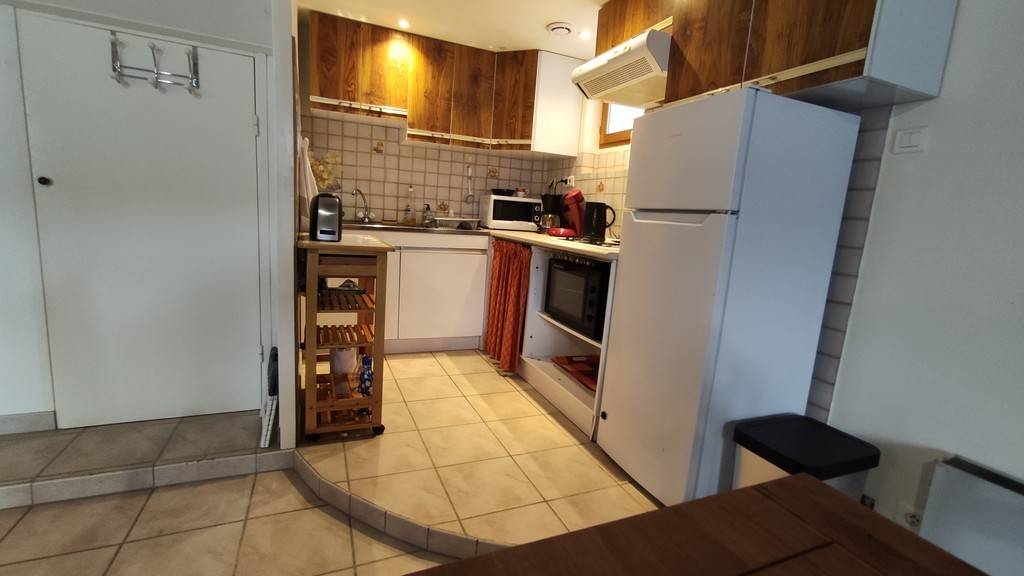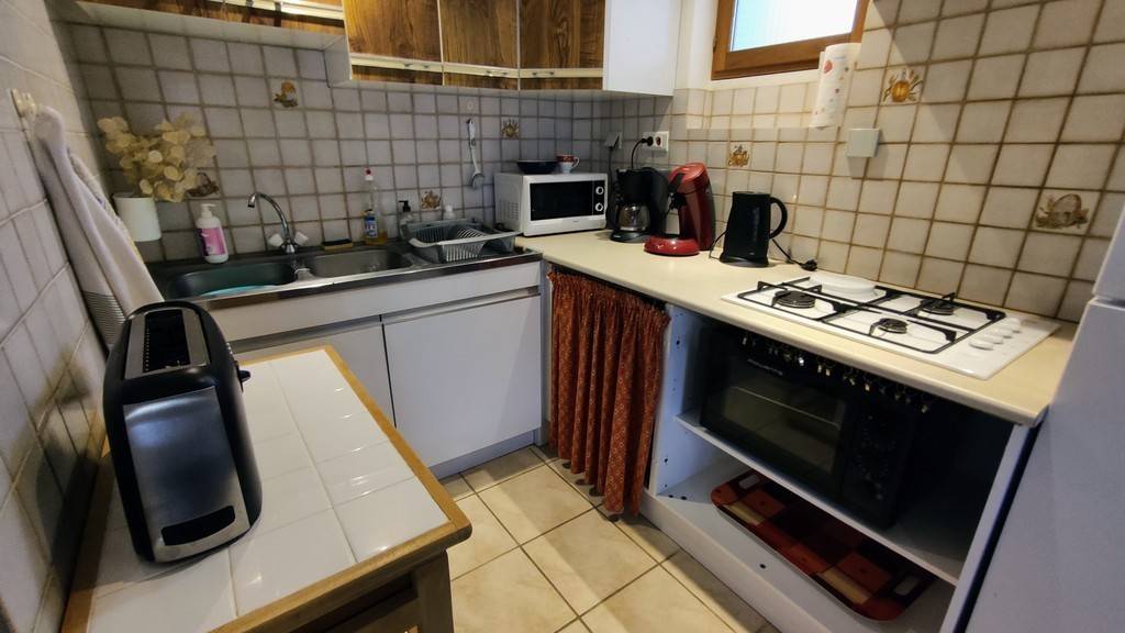 Cuisine : four, micro-onde, table de cuisson, hotte, frigo-congélateur, cafetière, cafetière Senseo, bouilloire électrique, grille pain.