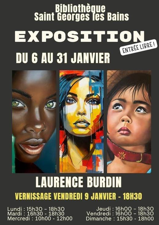 La bibliothèque de Saint-Georges-les-Bains présente les œuvres vibrantes de Laurence Burdin, peintre autodidacte ardéchoise : portraits et compositions hautes en couleurs.