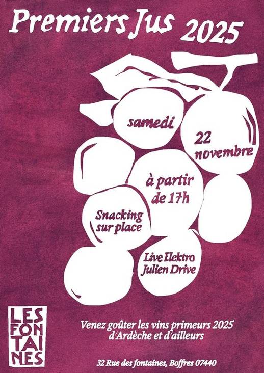 Nous avons le plaisir de vous convier à venir célébrer les vins primeurs 2025 d'Ardèche et d'ailleurs au restaurant Les Fontaines.